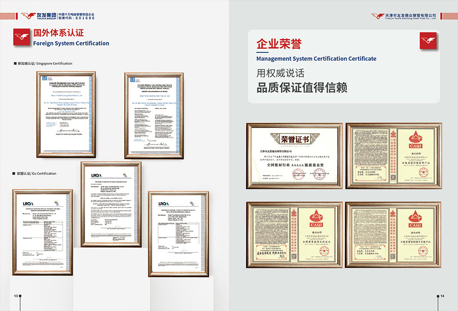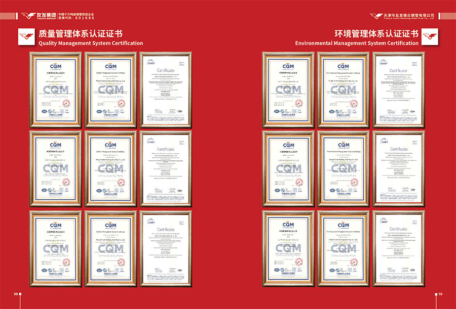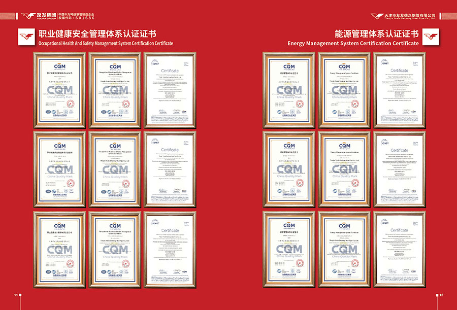 多年来,友发德众坚持以人为本,注重科技创新,率先引进精益管理。在稳步提高产品质量的同时,积极探索环境、安全、能源建设新路径。友发德众先后通过IS09001:2015质量管理体系认证、IS014001:2015环境管理体系认证、IS045001:2018职业健康安全管理体系认证、IS050001:2018能源管理体系认证、新加坡FPE认证、欧盟CPR认证、商品售后服务评价体系认证、诚信管理体系认证。