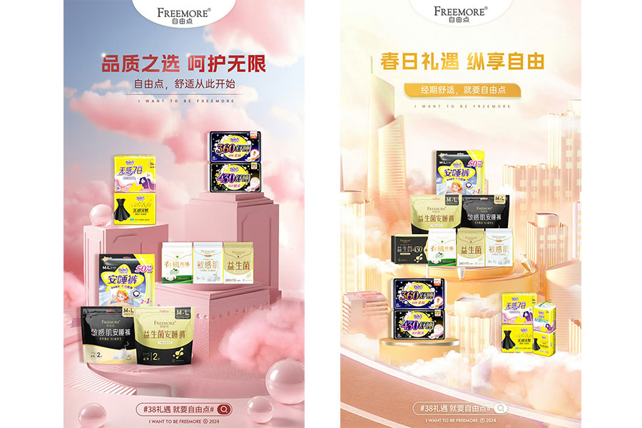 主要产品:自由点益生菌卫生巾、有机纯棉卫生巾、敏感肌卫生巾、无感七日卫生巾、好之系列纸尿裤、拉拉裤