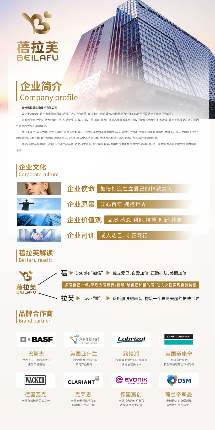 蓓拉芙,是一家集配方研发、产品生产、平台运营、媒体推广、营销服务、物流配送为一体的互联网电商平台,也是正在高速成长的互联网创新型企业。蓓拉芙主营化妆品、营养美容食品、女性健康、IT技术、茅台镇酱香白酒等系列产品。