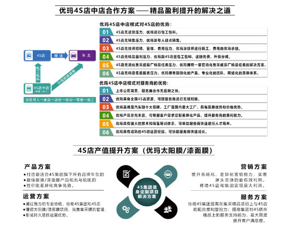 未来,通过在4S店内建立品牌连锁汽车膜服务店,汽车膜将不再以价格为主导进入4S店体系,优玛品牌店中店将以项目解决方案为核心,将服务贯穿整个项目生命周期:导入、建店、选材、培训、营销、施工和售后。优玛品牌店中店针对不同的4S店,以充分洞察消费者需求为前提,为4S店量身定制产品及营销方案。