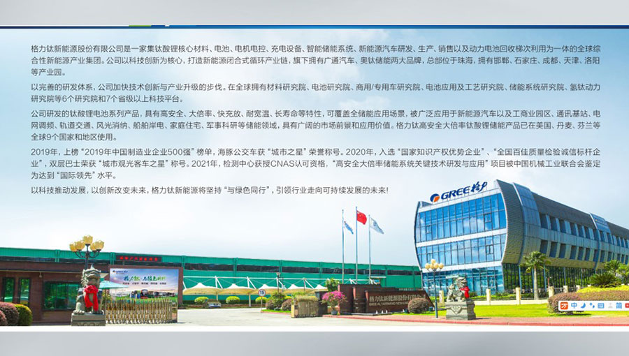 格力钛新能源股份有限公司是一家集钛酸锂核心材料、电池、电机电控、充电设备、智能储能系统、新能源汽车研发、生产、销售以及动力电池回收梯次利用为一体的全球综合性新能源产业集团。格力钛新能源以科技创新为核心,打造新能源闭合式循环产业链,旗下拥有广通汽车、奥钛储能两大品牌,总部位于珠海,拥有邯郸、石家庄、成都、天津、洛阳等产业园。