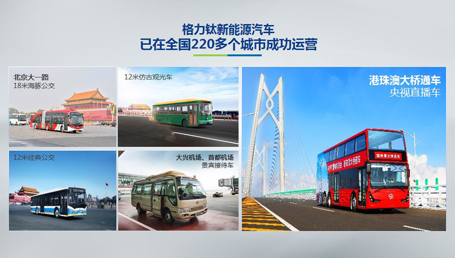 目前,格力钛生产的新能源汽车于北京、杭州、武汉、青岛、哈尔滨、包头、海口等全国220多个城市运营。2014年,仿古铛铛车荣膺第22届北京APEC会议官方指定用车、登陆北京环天安门旅游观光线。2016年,双层巴士荣膺第二届中美低碳峰会指定用车、登陆国内首条纯电动双层观光车线路——北京城市旅游观光3线。2017年,18米海豚公交车投入北京长安街1路运营。2018年,港珠澳大桥正式通车,双层巴士担纲中央广播电视总台直播车,成为首辆驶上港珠澳大桥的大巴车。