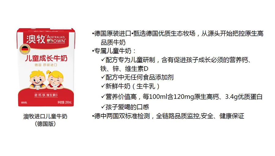 主要产品:澳牧原装进口儿童牛奶、澳牧原装进口A2β-酪蛋白纯牛奶、澳牧原装进口配方酸奶、澳牧自然保护力全家营养奶粉等高端乳制品