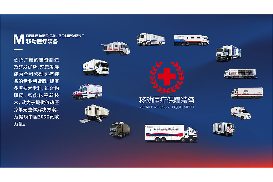 移动医疗装备板块,依托广泰的装备制造及研发优势,现已发展成为全科移动医疗装备的专业制造商。拥有多项技术专利,结合物联网、智能化等新技术,致力于提供移动医疗单元整体解决方案,为健康中国2030贡献力量。