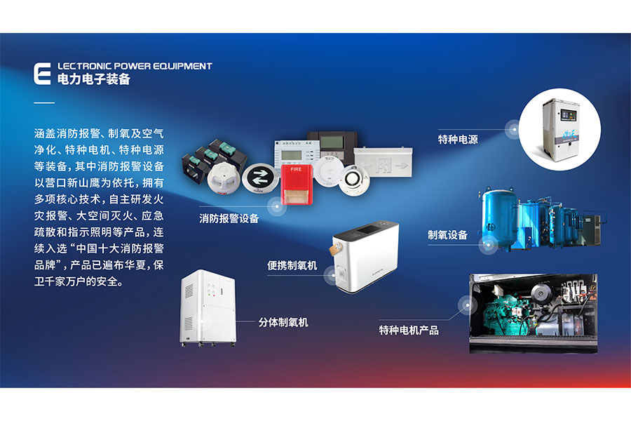 电力电子装备板块,涵盖消防报警、制氧及空气净化、特种电机、特种电源等装备,其中消防报警设备以营口新山鹰为依托,拥有多项核心技术,自主研发火灾报警、大空间灭火、应急疏散和指示照明等产品,连续入选“中国十大消防报警品牌”,产品已遍布华夏,保卫千家万户的安全。