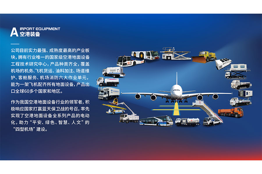 空港装备板块是公司目前实力最强、成熟度最高的产业板块,拥有行业唯一的国家级空港地面设备工程技术研究中心,产品种类齐全,覆盖机场的机务、飞机货运、油料加注、场道维护、客舱服务、机场消防六大作业单元,能为一架飞机配齐所有地面设备,产品出口全球60多个国家和地区。作为我国空港地面设备行业的领军者,积极响应国家打赢蓝天保卫战的号召,率先实现了空港地面设备全系列产品的电动化,助力“平安、绿色、智慧、人文”的“四型机场”建设。