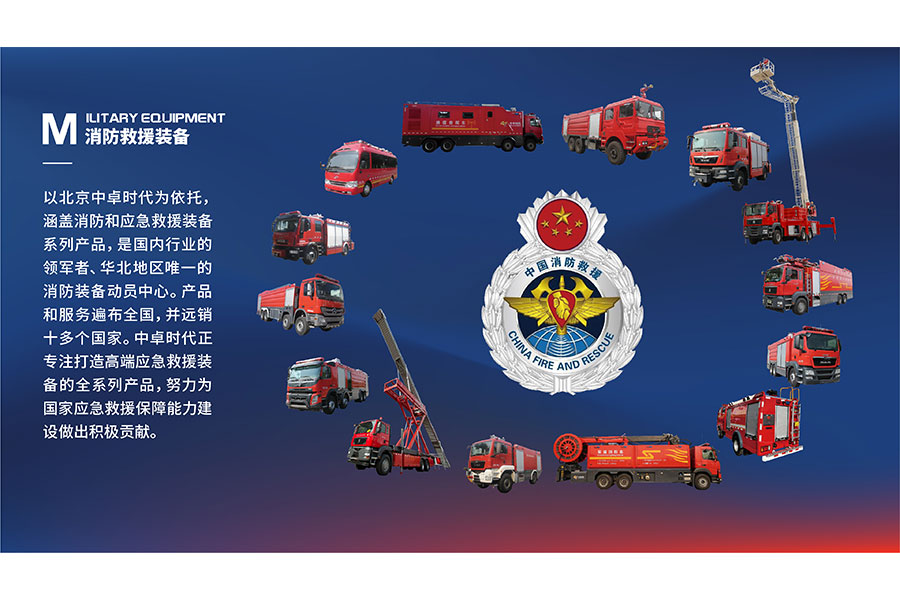 消防救援装备板块,以北京中卓时代为依托,涵盖消防和应急救援装备系列产品,是国内行业的领军者、华北地区唯一的消防装备动员中心。产品和服务遍布全国,并远销十多个国家。中卓时代正专注打造高端应急救援装备的全系列产品,努力为国家应急救援保障能力建设做出积极贡献。