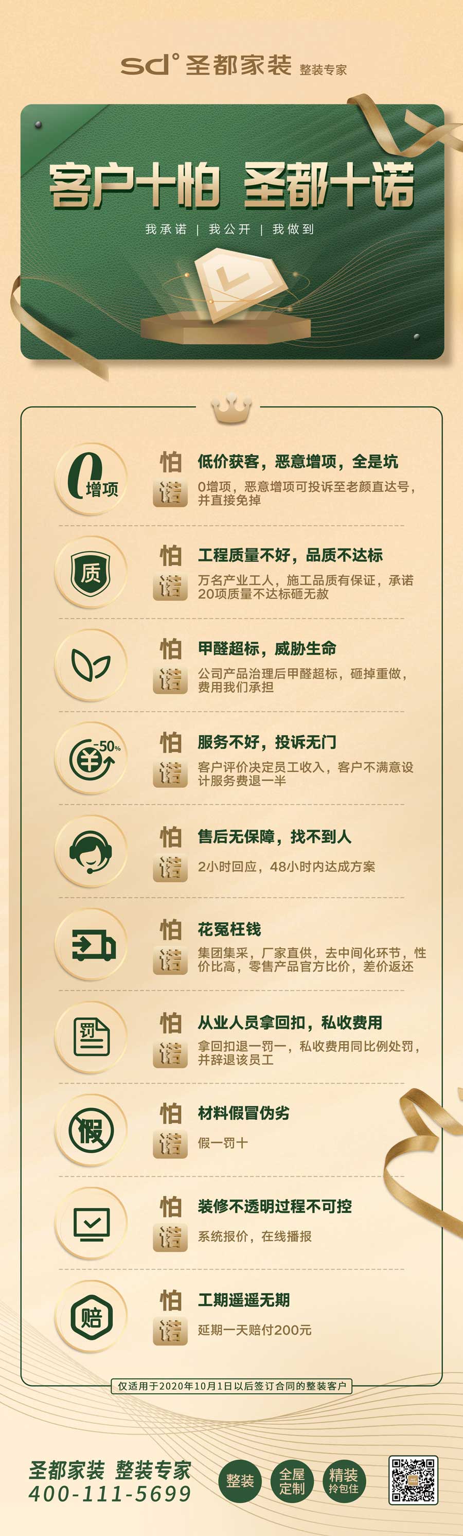 在服务方面,圣都创立了“客户十怕,圣都十诺”的服务体系,包含“0 增项”、“20 项工程不达标砸无赦”、“2小时快速响应,24小时达成方案”、“客户的评价决定员工的收入。”等等。