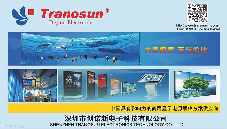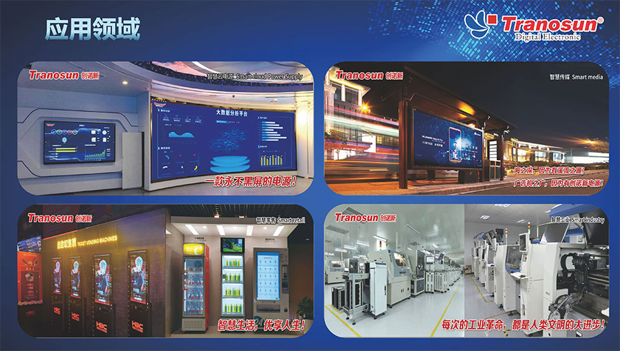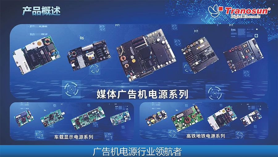 主要产品:Tranosun广告机电源、教育/会议一体机电源、拼接屏/监视器电源、高铁/地铁电源、DC-DC车载电源、LED小间距/彩屏电源、户外广告机/新能源电源、终端机/售卖机电源、商用广告机功放板、功放电源