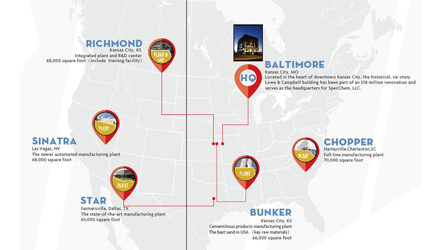 施贝建筑化学总部在美国著名的化工城堪萨斯,施贝化学集团着眼亚洲中国市场的开发,于2010年进入中国,并在上海成立施贝化学(中国)有限公司,来服务亚太地区的市场;2018年于江苏苏州纳米城,成立了施贝亚太研发中心。在美国的前身是由位于化学建材领域的前三位的化学建材公司融合而成。
