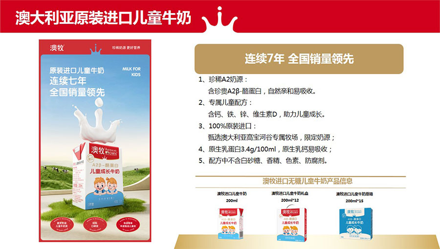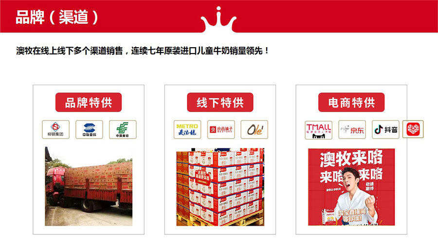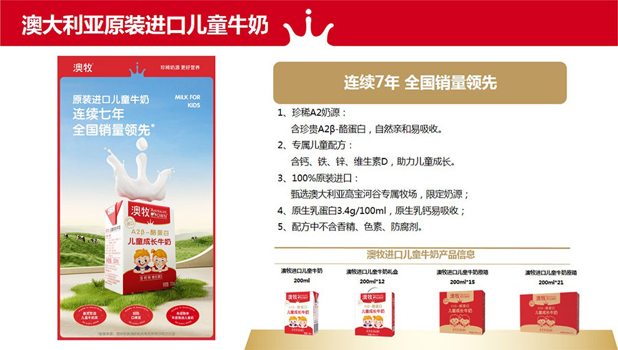 澳牧在线上线下多个渠道销售,连续七年保持原装进口儿童牛奶销量领先。