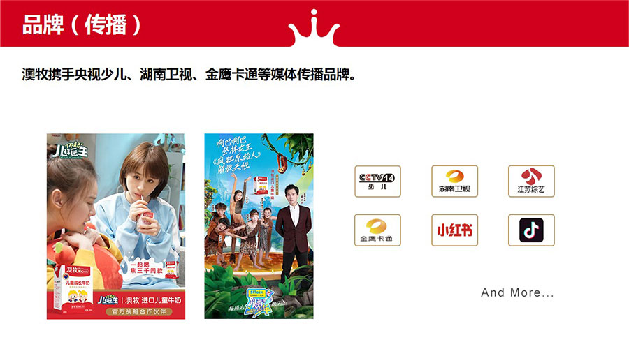 澳牧携手央视少儿、湖南卫视、金鹰卡通等媒体,共同传播品牌。