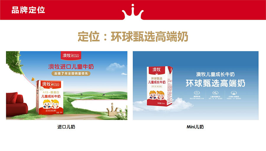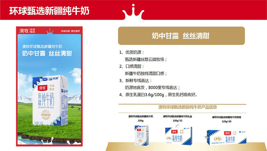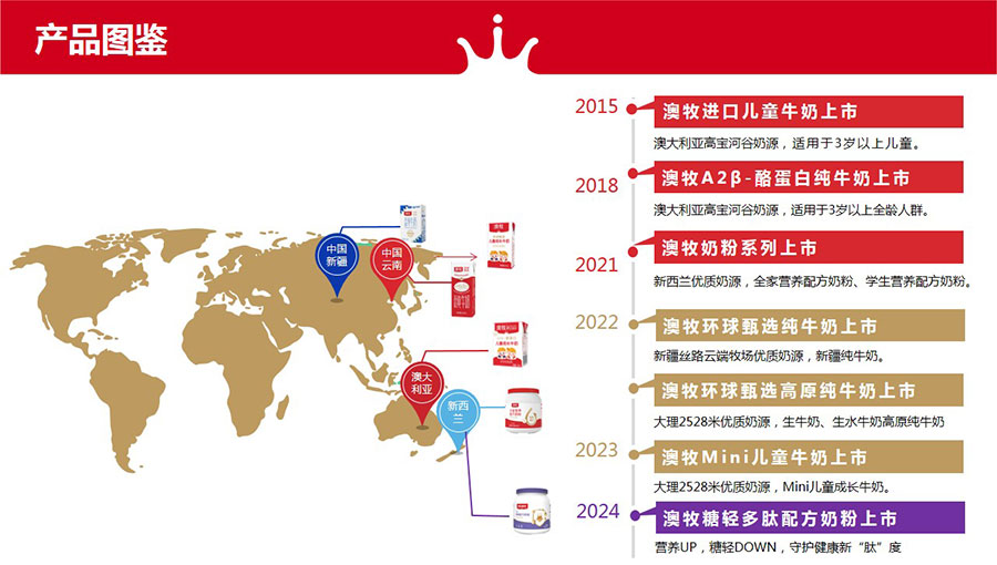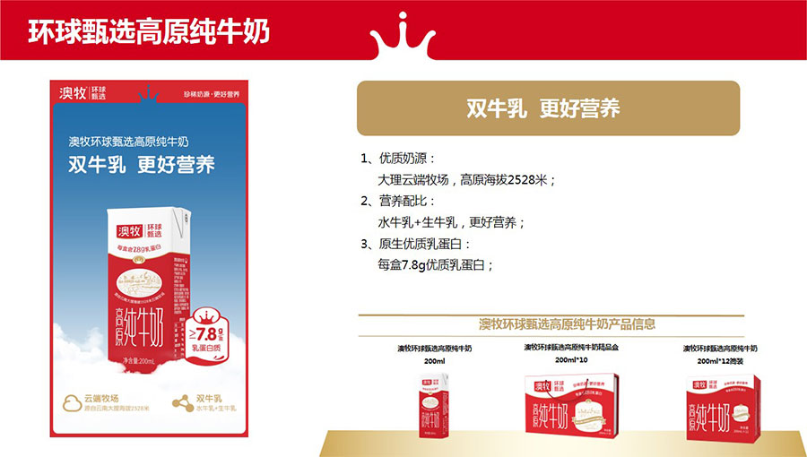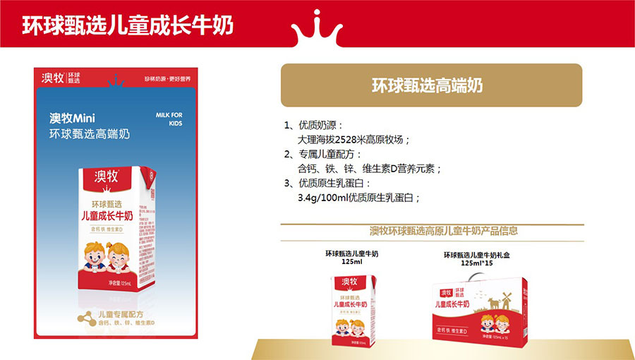 澳牧环球甄选高端乳制品精选澳大利亚、新西兰、新疆等多个黄金奶源带奶源。目前上市的产品包括:原装进口儿童成长牛奶、A2β-酪蛋白纯牛奶、全家营养配方奶粉、糖轻多肽配方奶粉、学生营养配方奶粉、新疆纯牛奶、高原纯牛奶、高原儿童成长牛奶。