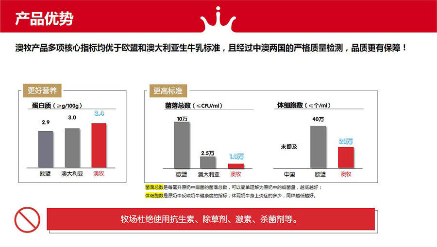 澳牧产品多项核心指标均优于欧盟和澳大利亚生牛乳标准,且经过中澳两国的严格质量检测,品质更有保障,从农牧场到餐桌,严格监管,确保品质安全。