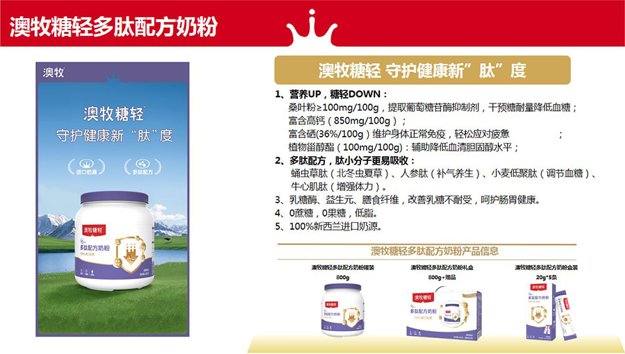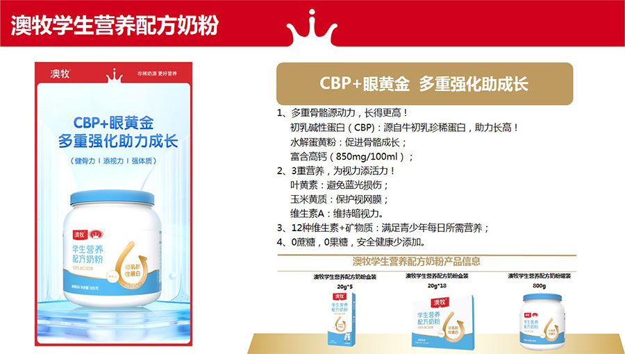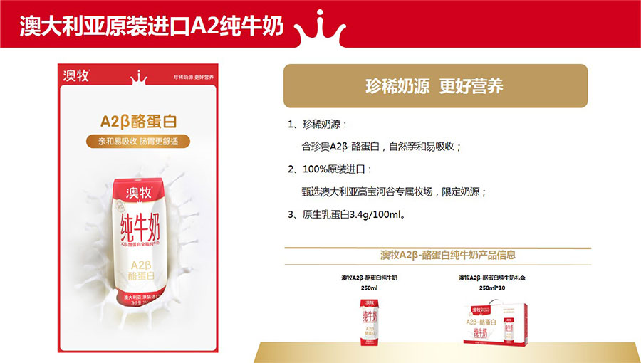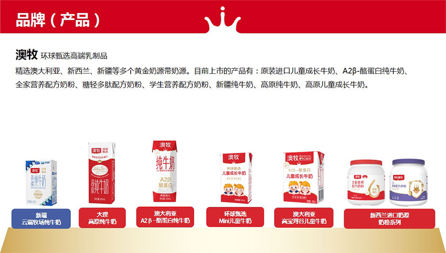 主要产品:澳牧进口儿童牛奶、澳牧A2β-酪蛋白纯牛奶、澳牧全家营养配方奶粉、澳牧哆护高学生营养配方奶粉、澳牧环球甄选新疆纯牛奶、澳牧环球甄选高原纯牛奶等高端乳制品