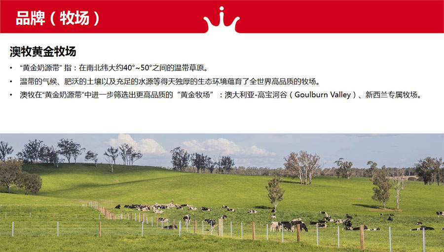 “黄金奶源带”指的是在南北纬大约40°~50°之间的温带草原,这里的温带气候、肥沃土壤以及充足的水源等得天独厚的生态环境孕育了全世界高品质的牧场。澳牧在“黄金奶源带”中进一步筛选出更高品质的“黄金牧场”,包括澳大利亚的高宝河谷(Goulburn Valley)和新西兰专属牧场。