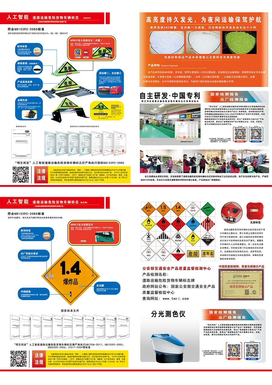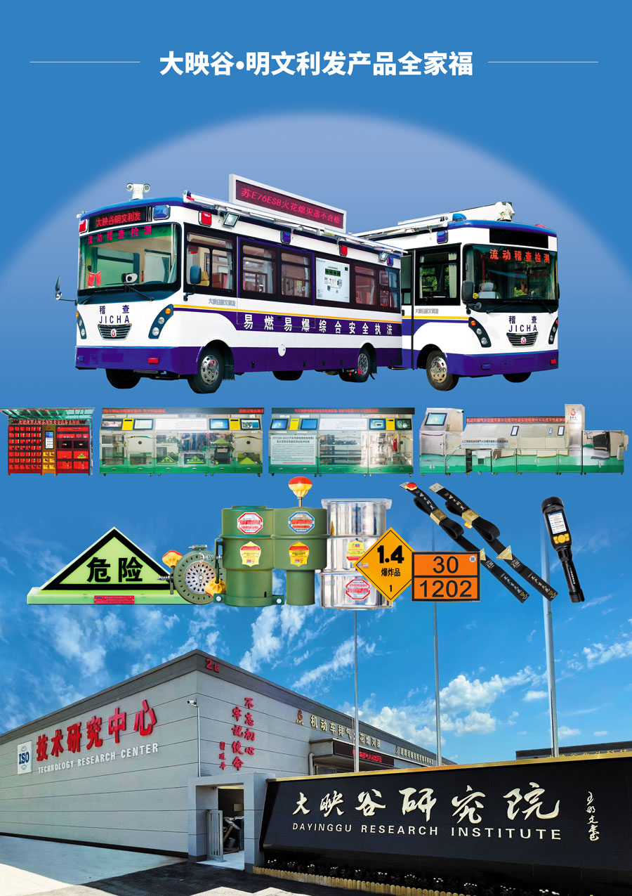 主要产品:北斗安防人工智管系统,火灾爆炸危险场所移动稽查车,危险品运输安全隐患移动检测车,危险品运输车辆安防装备租售检测亭,不产生火花人工智能汽车导静电橡胶拖地带,人工智能机动车排气火花熄灭器,人工智能道路运输危险货物车辆标志灯、标志牌