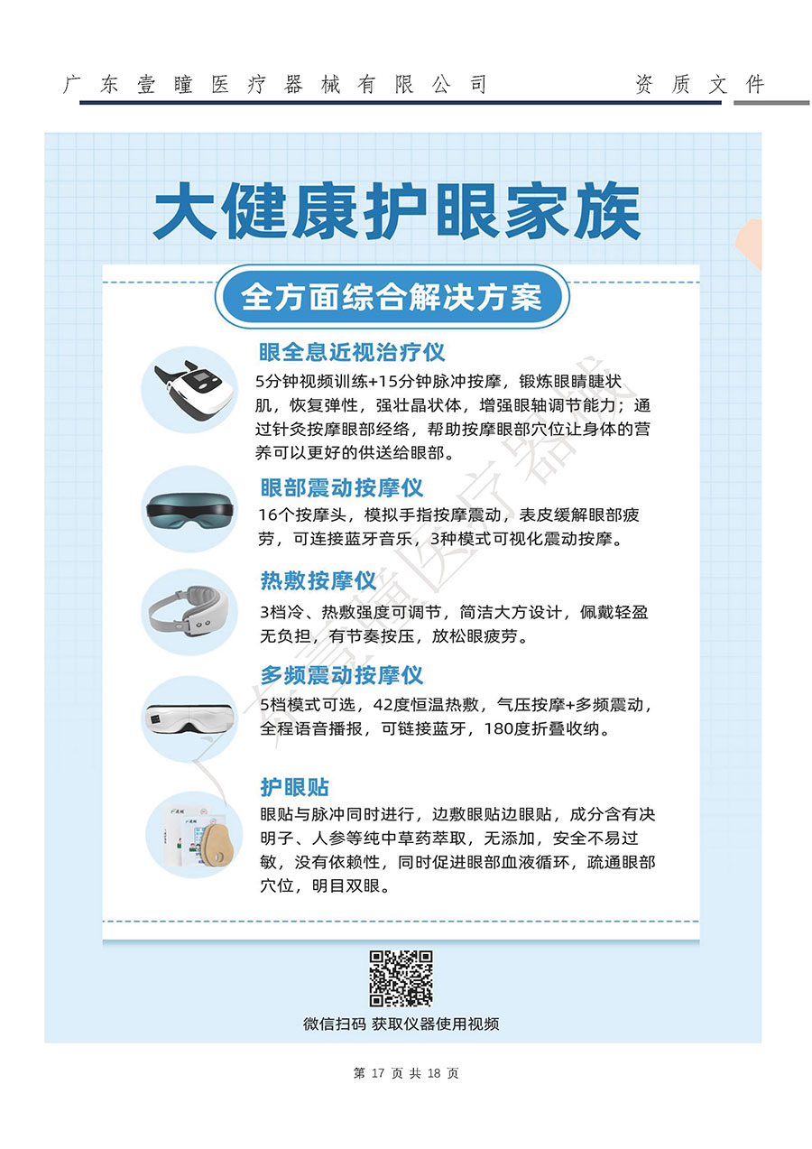 广东壹瞳医疗器械有限公司创始于2018年,前身主要代加工其它品牌产品,从2020年起增加自创品牌,开创线上线下等多种销售合作模式。由PICC中国人保承保,前期专注于护眼视力健康产品,现已自主研发10+款产品,产品质优价廉,深受消费者青睐,后期增加腰间盘突出、颈椎疼痛等大健康理疗器械。