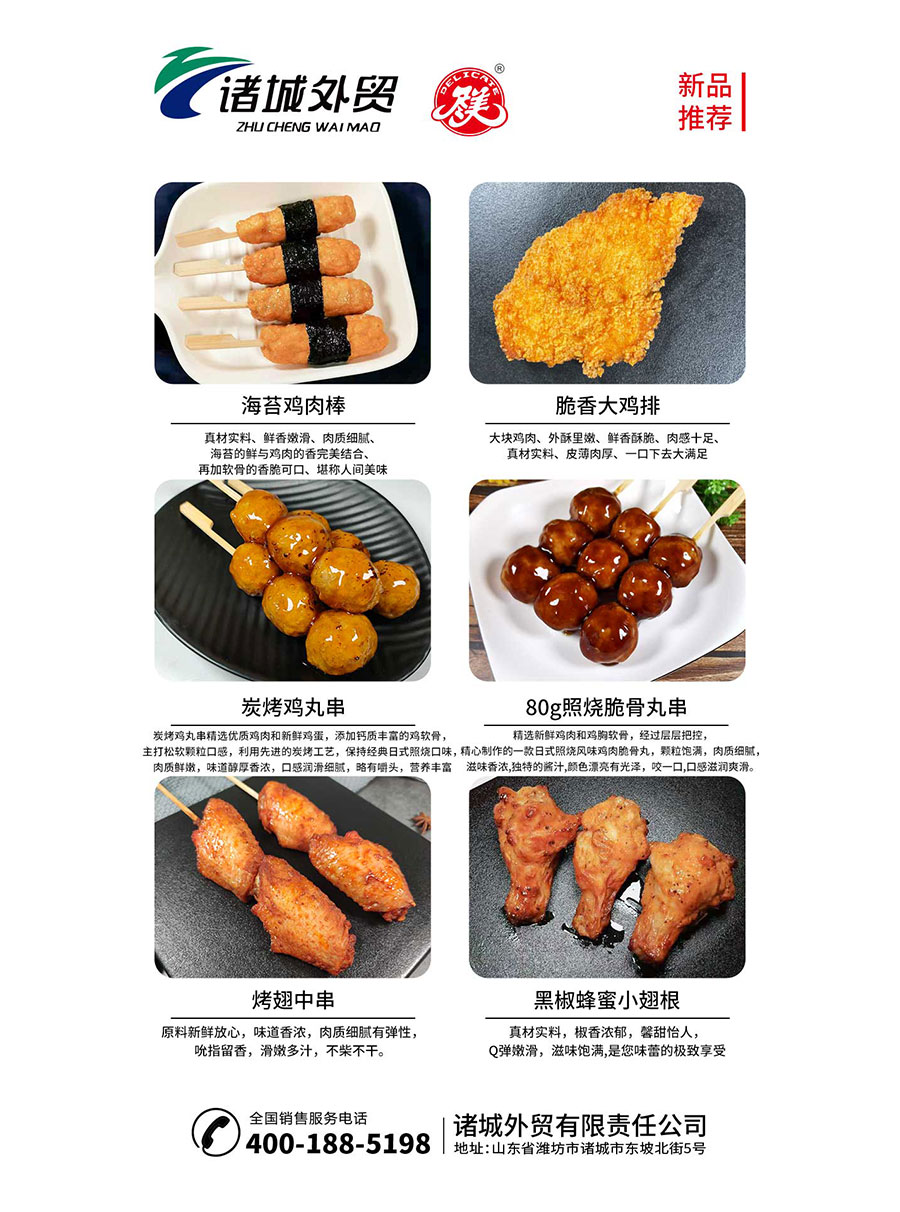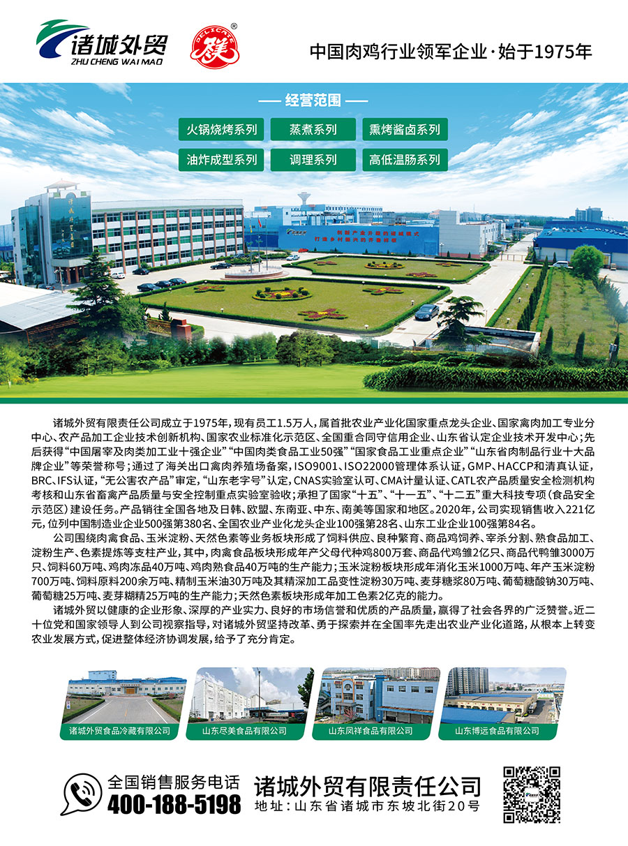 诸城外贸以禽肉食品、玉米淀粉、天然色素等业务板块为核心,构建了饲料供应、良种繁育、商品鸡饲养、宰杀分割、熟食品加工、淀粉生产、色素提炼等主要产业。其中,肉禽食品板块具备年产父母代种鸡800万套、商品代鸡雏2亿只、商品代鸭雏3000万只、饲料60万吨、鸡肉冻品40万吨、鸡肉熟食品20万吨的生产能力;玉米淀粉板块具备年消化玉米1000万吨、年产玉米淀粉700万吨、饲料原料200余万吨、精制玉米油30万吨及其精深加工品变性淀粉30万吨、麦芽糖浆80万吨、葡萄糖酸钠30万吨、葡萄糖25万吨、麦芽糊精25万吨的生产能力;天然色素板块具备年加工色素2亿克的能力。2023年实现销售收入332.65亿元,位列中国制造业企业500强第322名、全国农业产业化龙头企业100强第28名、山东工业企业100强第84名。产品畅销全国各地及日韩、欧盟、东南亚、中东、南美等国家和地区,其中玉米淀粉产销量居全国首位。