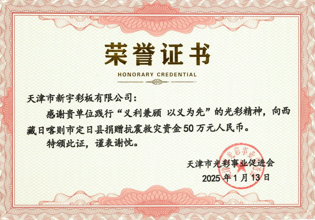 天灾无情人有情。地震发生后,天津新宇勇担民企责任,迅速行动,通过天津市光彩事业促进会捐赠50万元,支援定日县抗震救灾和灾后重建工作,为灾区同胞早日渡过难关贡献绵薄之力。