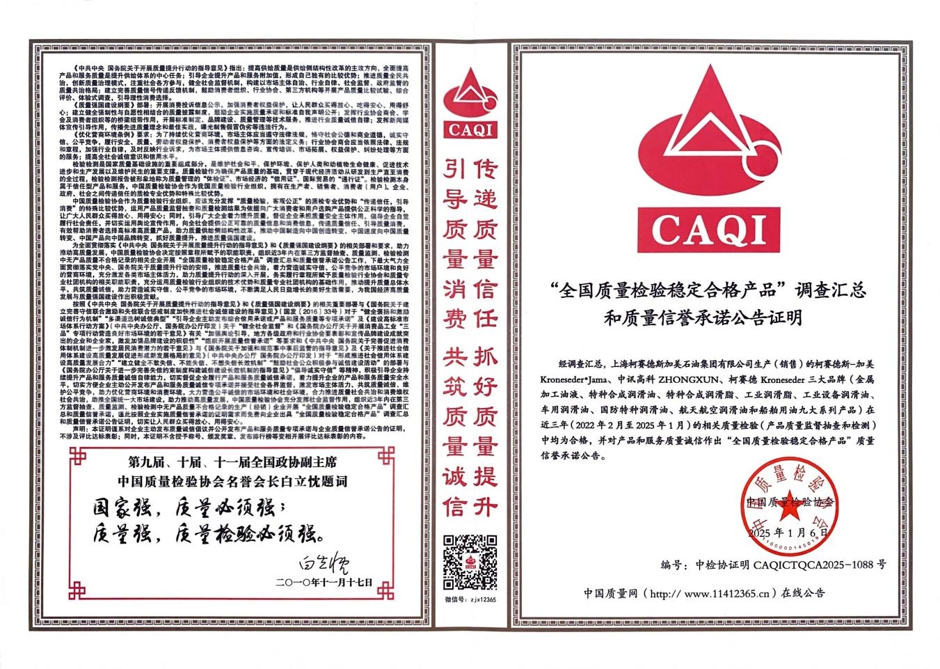 新年伊始,上海柯赛德斯加美石油集团有限公司收到来自中国质量检验协会的证书(编号:中检协证明 CAOICTOCA2025-1088号),证书说:经调查汇总,上海柯赛德斯加美石油集团有限公司生产(销售)柯赛德Kroneseder、中讯高科ZHONGXUN、的柯赛德斯-加美润滑油Kroneseder·Jama 三大品牌(金属加工油液、特种合成润滑油、特种合成润滑脂、工业润滑脂、工业设备润滑油、车用润滑油、国防特种润滑油、航天航空润滑油和船舶用油九大系列产品)在近三年(2022年2月至2025年1月)的产品质量监督抽查和检测中均为合格,并对产品和服务质量诚信作出“全国质量检验稳定合格产品”质量信誉承诺公告。
