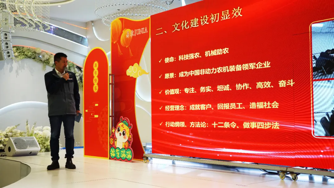 2025年1月18日下午,山东优尼亚农业机械有限公司(简称“优尼亚”或“公司”)在齐河迎禧煌嘉酒店,隆重举办2025年度目标责任状签订仪式暨新春年会。公司股东代表、管理层、全体员工及部分员工家人130余人参加本次活动。活动现场气氛热烈,群情激昂。